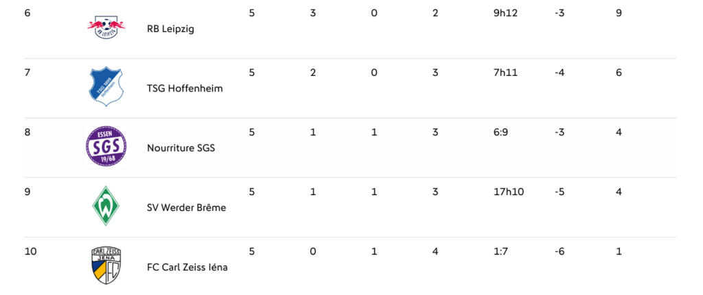 Le milieu actuel du classement (place 6 – 9 / 4 – 9 points) est occupé par TSG Hoffenheim, RB Leipzig, SGS Essen, SV Werder Bremen. Il faut attendre pour voir dans quelle direction elles se dirigent. Surtout pour TSG Hoffenheim, c’est un début décevant.