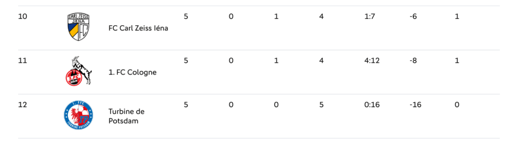 Le 1. FC Köln – si ambitieux en foot féminin, et dans la ville où chaque année est jouée la finale de la Coupe du foot féminin – se trouve sur l’avant-dernière place !